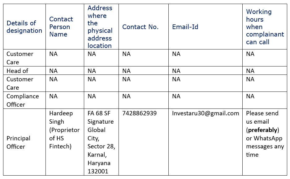 You may send us an email (preferably) or WhatsApp message or write a letter to us at our registered address (FA 68 SF Signature Global City, Sector 28, Karnal Haryana 132001). We shall try our best to resolve your grievance within 7 business days of receiving it.